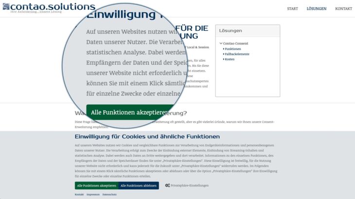 Die Anwendung der Einwilligungen und somit das Ausspielen einwilligungspflichtiger Inhalte erfolgt im Browser. Es erfolgt keine Übertragung zum Server, womit auch keine Funktionen von Contao eingeschränkt werden. Insbesondere die Nutzung der serverseitigen Caching-Funktion in Contao ist weiterhin ohne Probleme möglich.