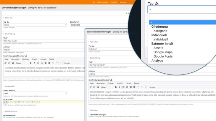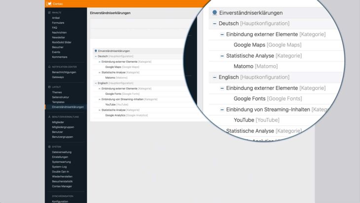 Auch das ist für unsere Erweiterung kein Problem. Durch die Möglichkeit mehrere Hauptkonfigurationen anzulegen und diese einem entsprechenden Seitenbaum zuzuordnen, können Sie problemlos mehrere Seitenbäume mit verschiedenen Einwilligungserklärungen ausstatten